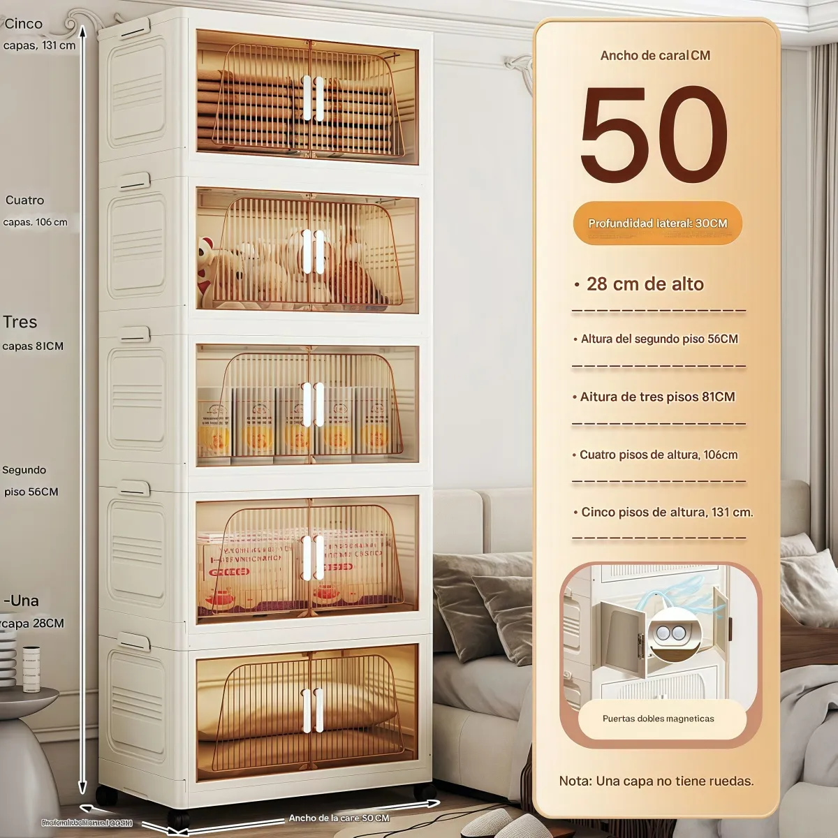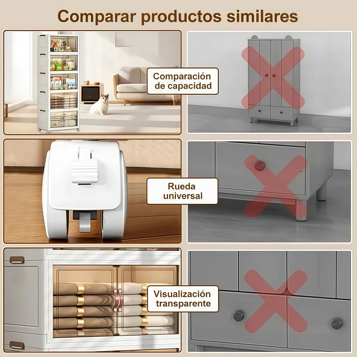 La estabilidad es nuestra prioridad: cada capa cuenta con ranuras y estructuras de encaje a presión que garantizan un cierre firme y seguro al apilar, evitando derrumbes incluso con carga completa. Cuando no estén en uso, se pliegan completamente hasta quedar planas, ahorrando hasta un 80% de espacio – ideales para guardar debajo de la cama, en el maletero del coche o en armarios pequeños. Además, equipadas con **5 ruedas omnidireccionales**, se mueven con fluidez en cualquier superficie: ajusta su posición con facilidad, incluso cuando están llenas, equilibrando perfectamente estabilidad y maniobrabilidad.