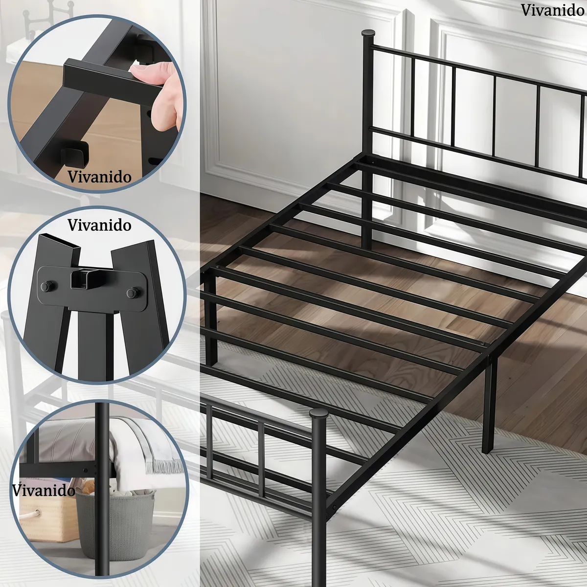Fuerza y Estabilidad: Este marco de cama de metal cuenta con pilares y patas de metal mejorados como soporte general, vivanido ofreciendo una gran resistencia y estabilidad. Es capaz de resistir la prueba del tiempo, garantizando que no se desarme ni se derrumbe con el uso prolongado. Nuestro marco de cama está fabricado con pilares de metal reforzado y material más grueso para una mayor resistencia y durabilidad. ¡Podrás dormir tranquilo todas las noches!